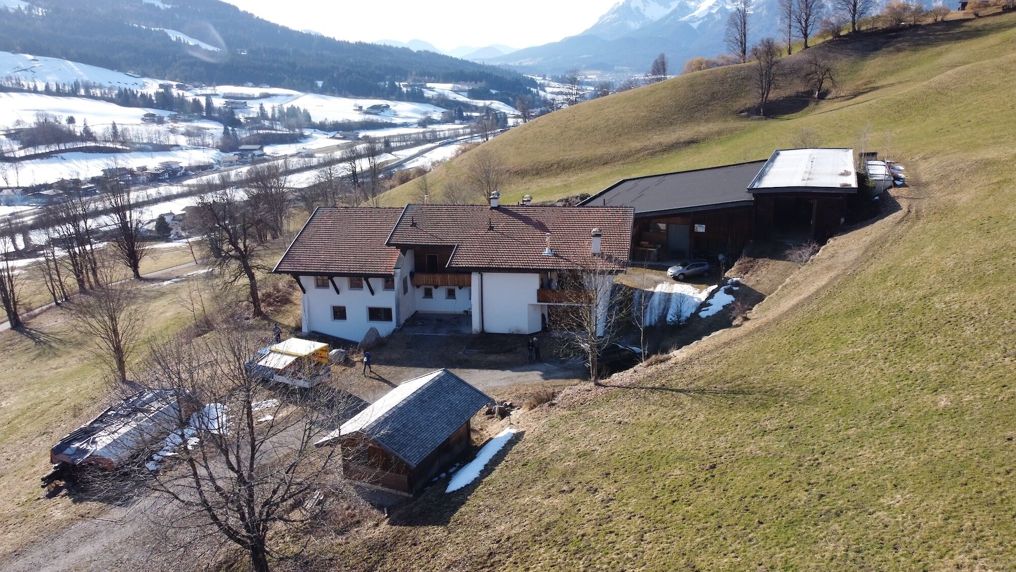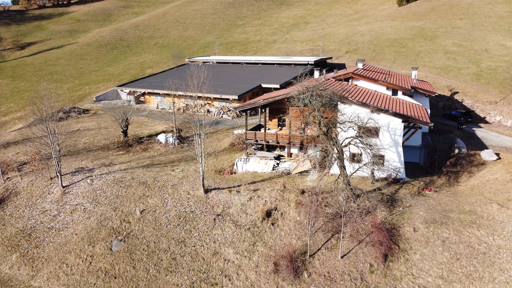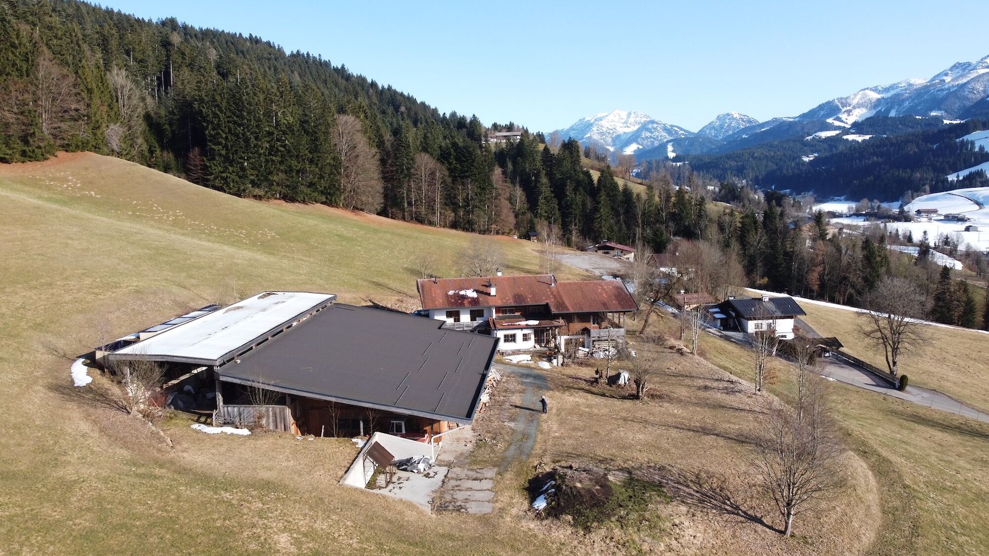 Hoch über dem Tal, auf der Sonnseite, liegt das außergewöhnliche Anwesen in absoluter Alleinlage. Auf etwa 760 m Seehöhe öffnet sich ein atemberaubendes Panorama der Tiroler Alpen: Im Osten erhebt sich der markante Wildseeloder, im Süden das legendäre Kitzbüheler Horn und im Westen beeindruckt das mächtige Kaisergebirge. Die Ost-West-Ausrichtung garantiert ganztägige Sonneneinstrahlung und schafft eine Atmosphäre von Ruhe, Weite und natürlicher Schönheit. Der Einzelhof ist eingebettet in eine idyllische Kulturlandschaft mit rund 10 Hektar Grund etwa 7 Hektar Wiesen und 3 Hektar Wald. Fernab von Industrie und Gewerbe genießen Sie hier ein Höchstmaß an Privatsphäre und Naturverbundenheit. Das großzügige Wohngebäude mit rund 650m² Nutzfläche wurde nach konsequent bauökologischen Prinzipien errichtet und vereint nachhaltige Bauweise mit beeindruckender Großzügigkeit. Massive 50 cm starke Liapor-Naturblähtonmauern, hochwertige Dämmung und moderne Niedertemperatur-Fußboden- und Wandheizung schaffen ein gesundes und energieeffizientes Wohnklima. Bereits fertiggestellt sind unter anderem eine Einliegerwohnung (ca. 80 m²) sowie eine großzügige Hauptwohnung (ca. 150 m²). Ein weitläufiger Seminar- oder Wohnraum, Gästezimmer und zahlreiche Nebenräume eröffnen vielfältige Nutzungsmöglichkeiten, von exklusivem Wohnen bis hin zu Retreat-, Seminar- oder Gästekonzepten. Zur Liegenschaft gehört außerdem ein großzügig konzipierter Laufstall mit 11 Pferdeboxen, Heu- und Nebenräumen, mit einer Grundfläche von ca. 28 × 32 m. Ein vorhandener Reitplatz kann über Servitut genutzt werden.