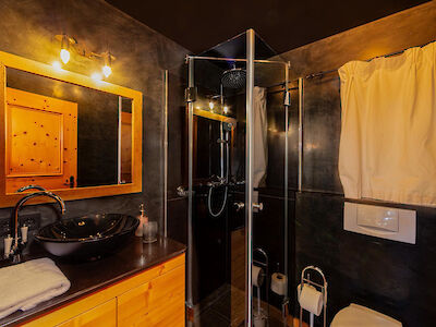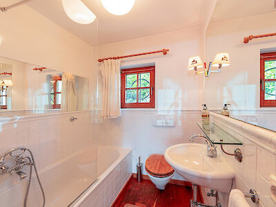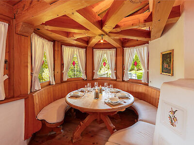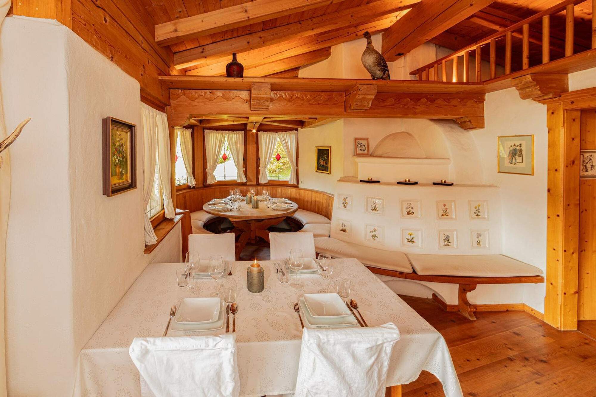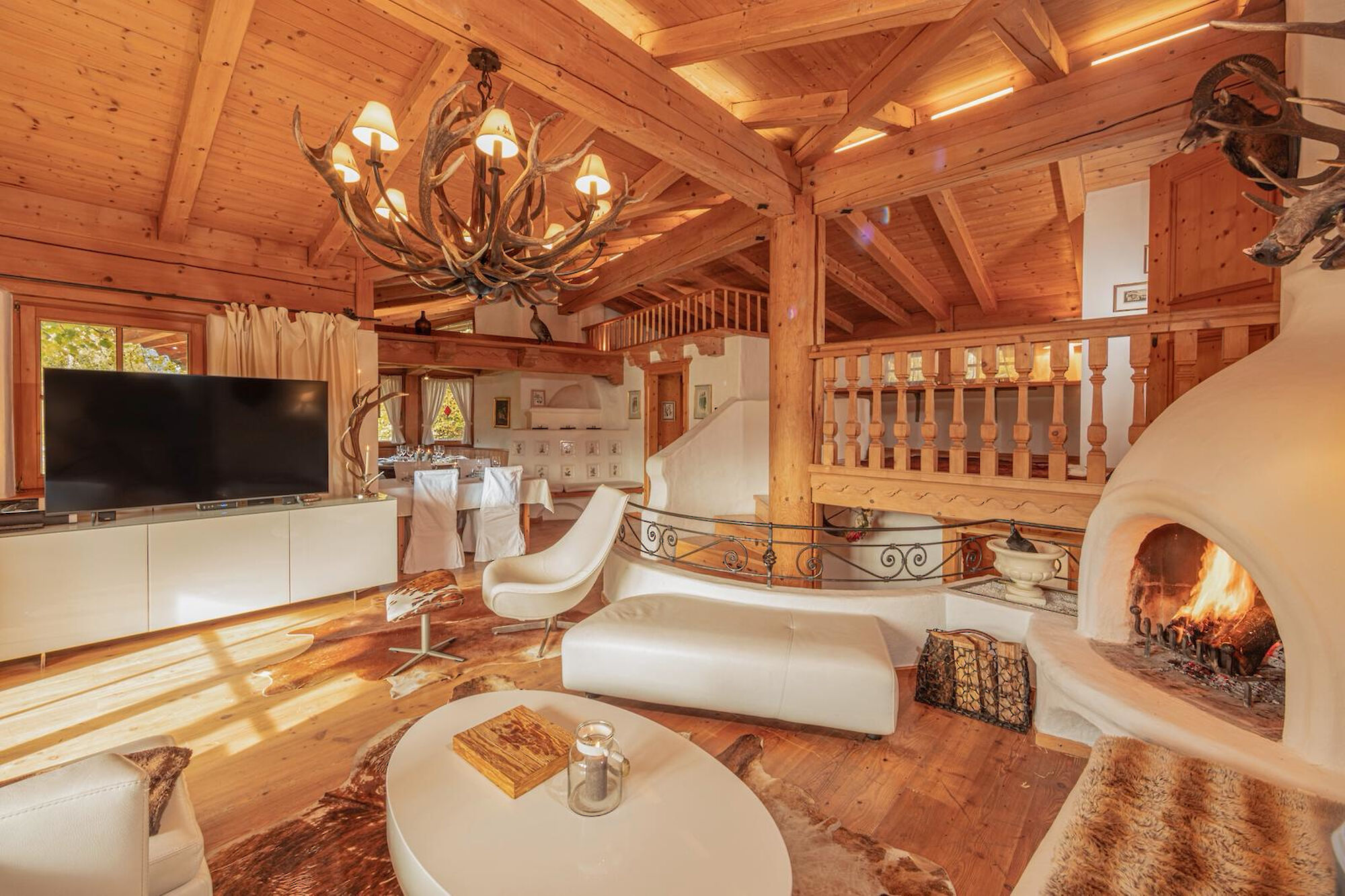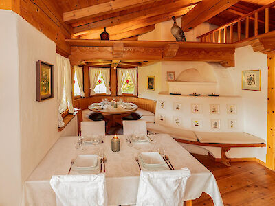 The main living area is designed as a place to unwind: an open fireplace and traditional tiled stove create a warm, grounded atmosphere, while the adjoining dining space invites for long, intimate evenings.