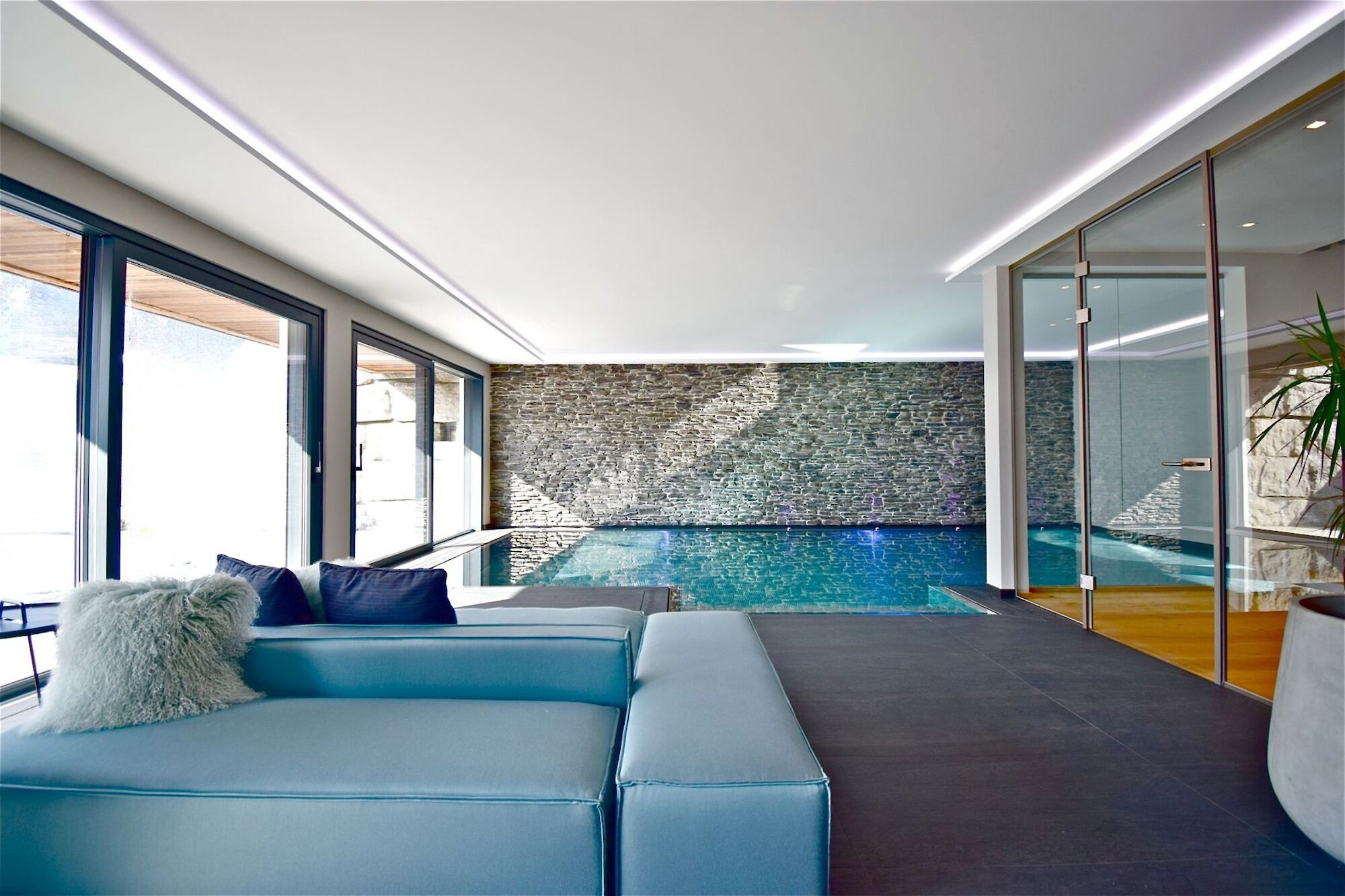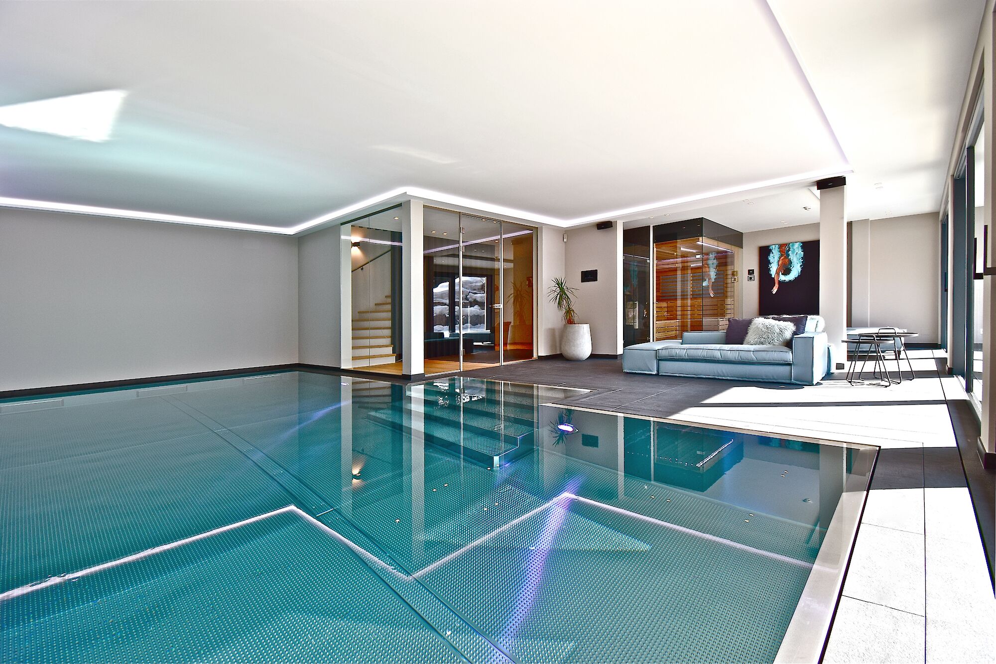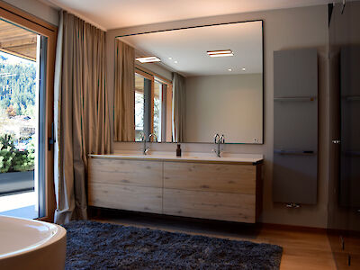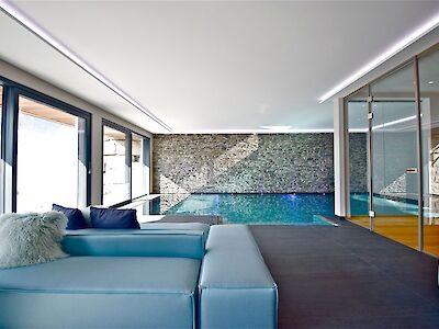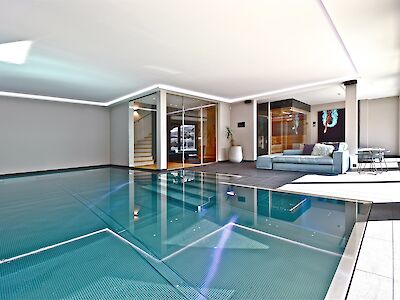 Inside, a generous living area opens up, featuring a fireplace and unobstructed views of the Streif. The open kitchen is seamlessly integrated and forms the communicative heart of the home. Three bedrooms, each with high-quality bathrooms, along with a spa suite with a large bathroom and a separate retreat area with its own bathroom, offer a high degree of privacy. A separate guest WC and a cloakroom complement the spacious entrance area. The private wellness area with indoor pool, sauna, and infrared cabin ensures independence from season and weather. A conservatory extends the wellness area. A wine cellar, a garage, and a modern home control system with bus technology, alarm system, and surveillance cameras emphasize the technical standard.