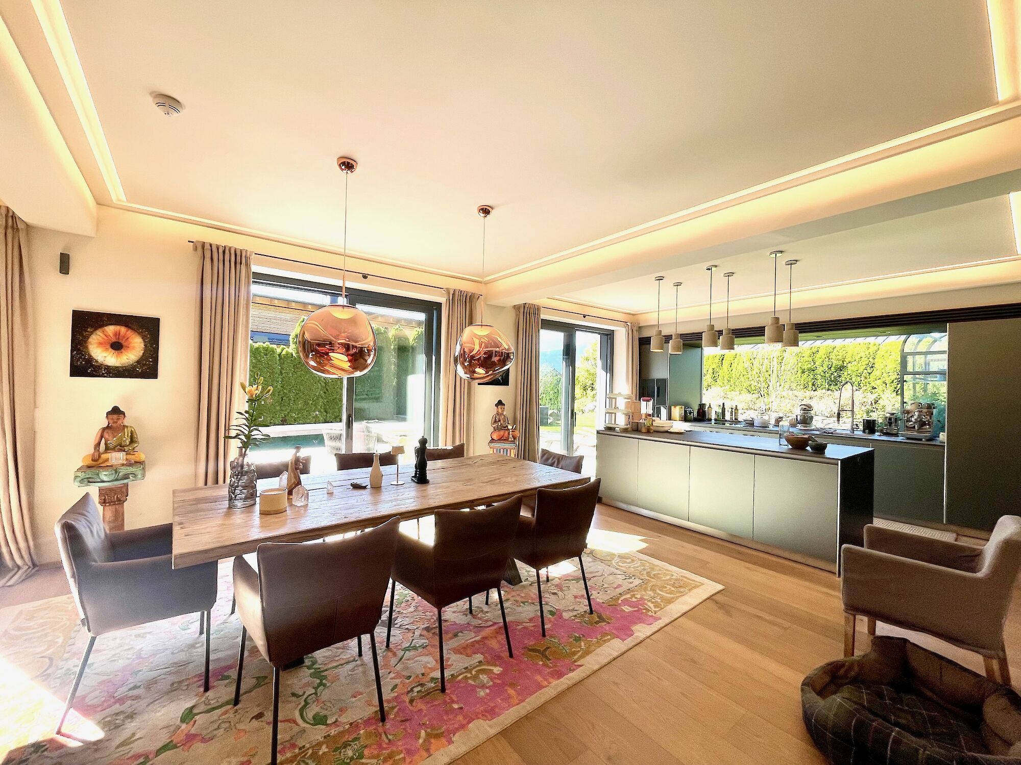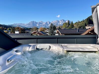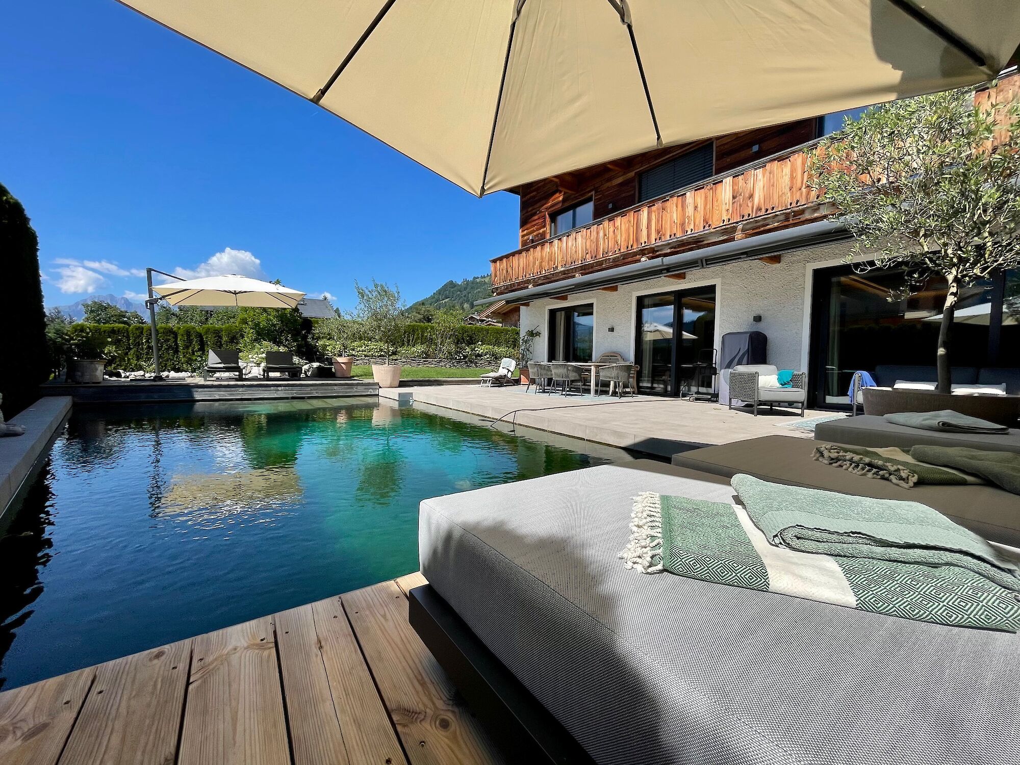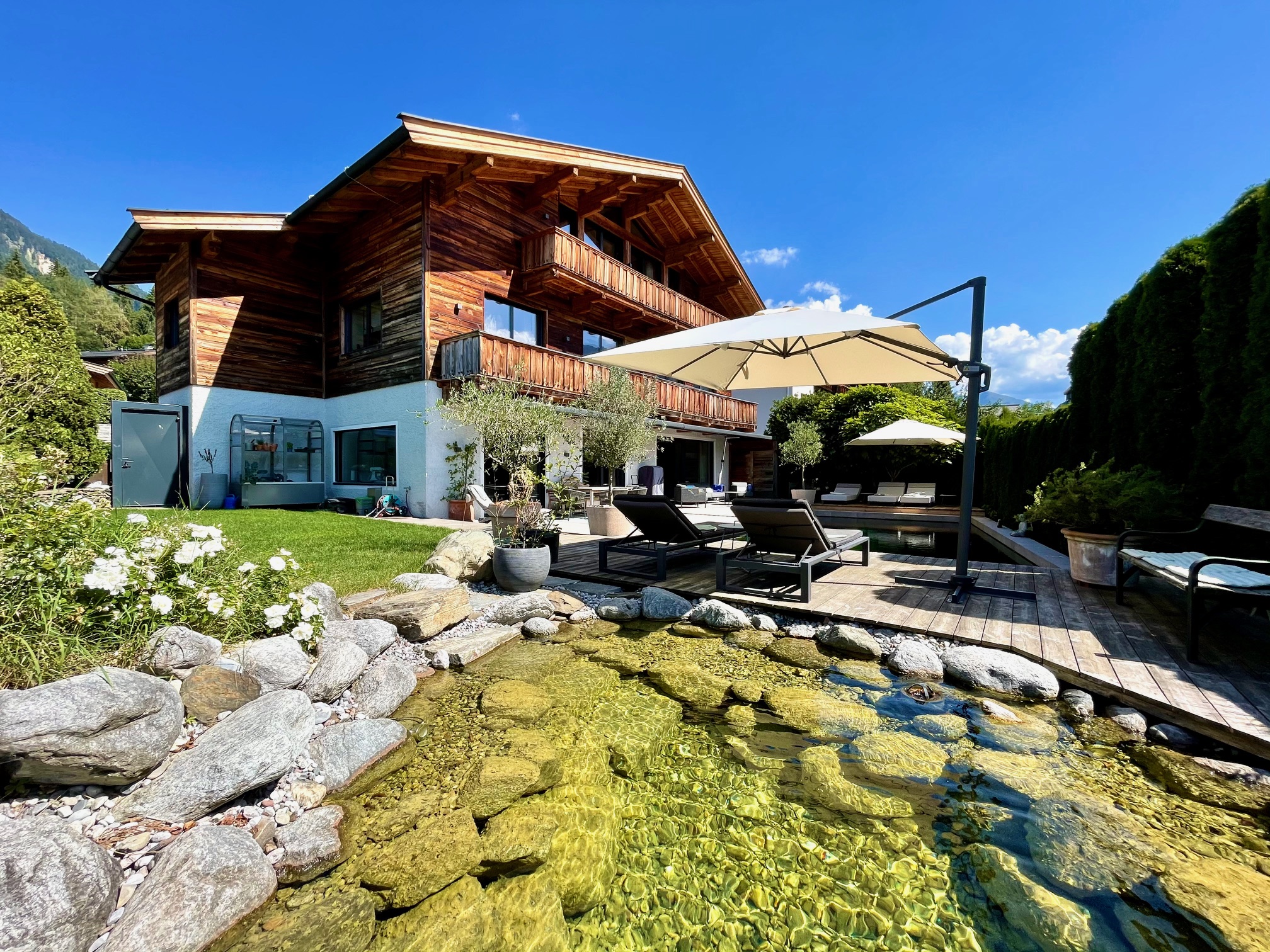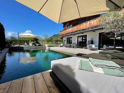 The property is situated in the absolute best location in Kitzbühel, on the Sonnberg, and features a natural swimming pool. The town center is easily reachable on foot in approximately five to ten minutes, and the Hornbahn cable car is also within easy walking distance. The Kitzbühel Schloss Kaps Golf Club is about 500 meters from the property. The living room with fireplace and open-plan kitchen, three bedrooms each with an en-suite bathroom on the first floor, and a master bedroom on the top floor with an en-suite bathroom, walk-in closet, and a roof terrace with a whirlpool are all included. A wellness area with a Finnish sauna, steam room, and infrared cabin is also available. Additional amenities include a utility room, cloakroom, four garage parking spaces, and three carport spaces. The house is heated and cooled by two heat pumps